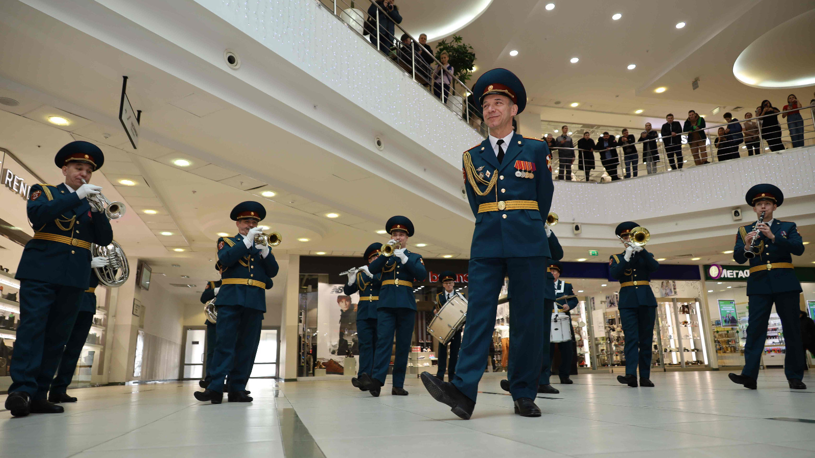В назначенное время, словно случайно прогуливающийся с трубой по вестибюлю торгового центра музыкант военного оркестра начал исполнять мелодию легендарной «Катюши». За ним мелодию подхватил следующий музыкант, потом появился ещё один, и так далее. Музыканты с разных сторон выходили, спускались по эскалатору, исполняя каждый свою партию знаменитой композиции, пока весь состав военного оркестра не выстроился на в холле.