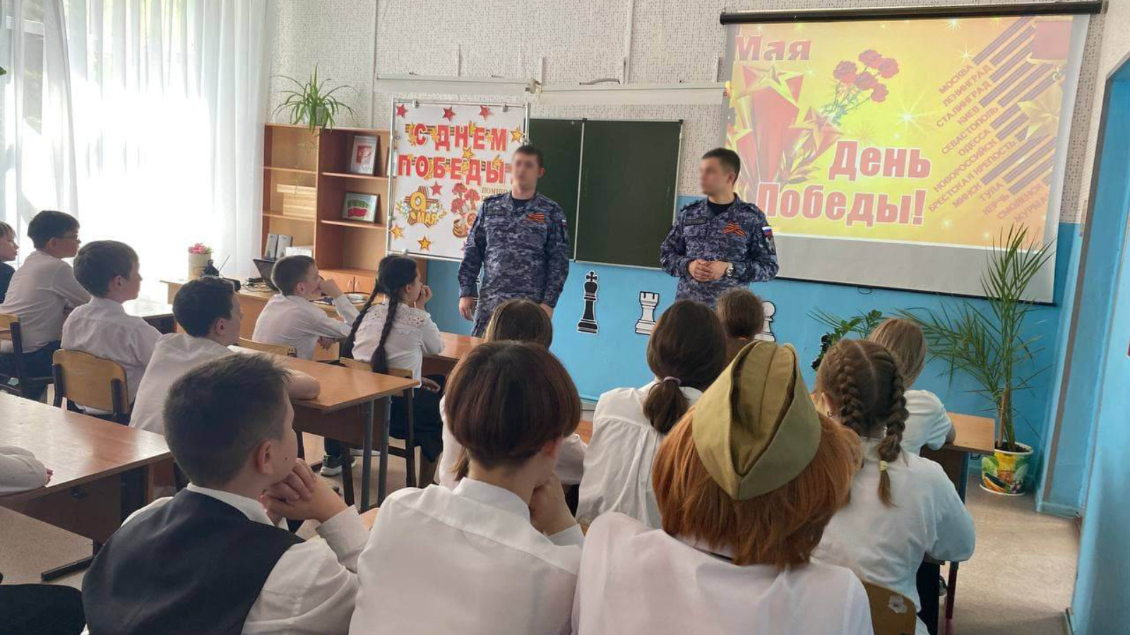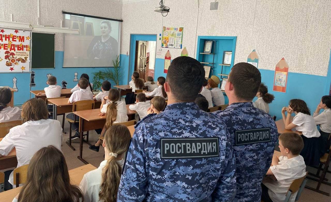 В ходе урока школьники задавали интересующие их вопросы по истории войны и войск правопорядка. Ребятам продемонстрировали документальный фильм об участии войск НКВД в Великой Отечественной войне. В завершении мероприятия военнослужащие и ученики сделали общую фотографию на память..jpg)