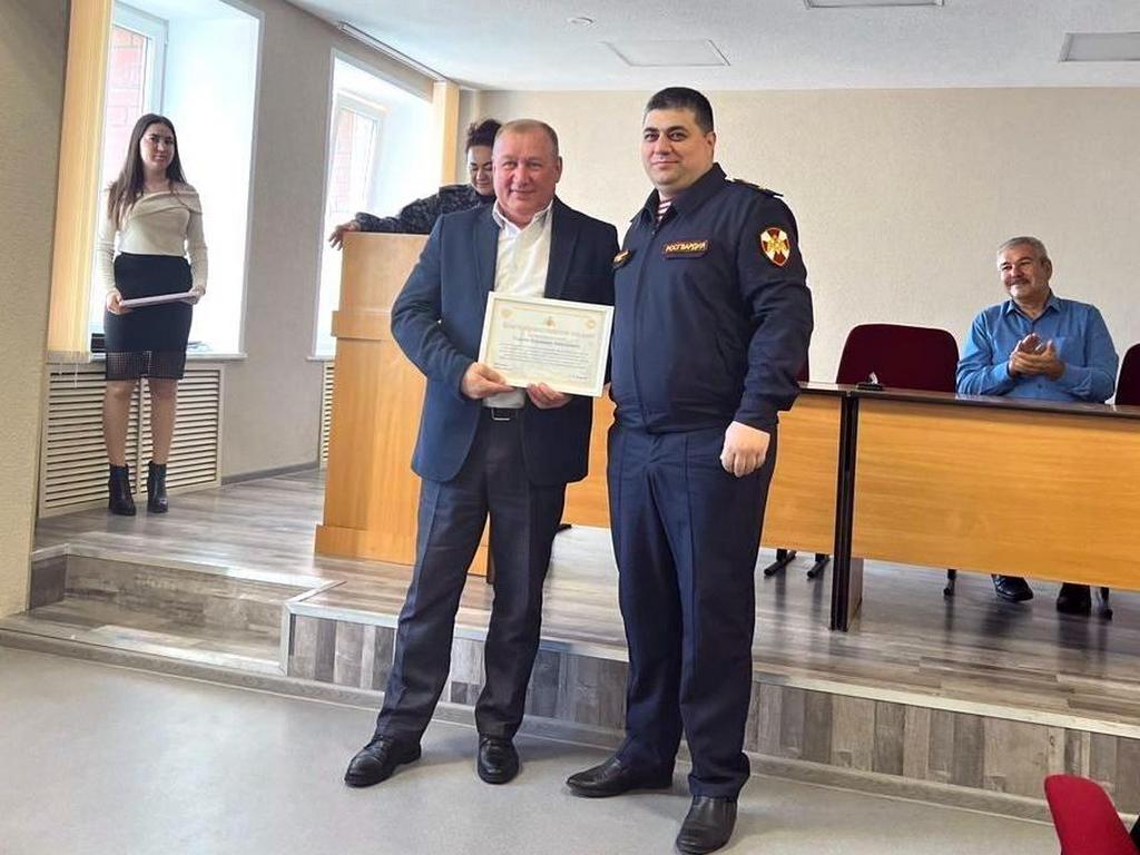 Наградил майор полиции Размик Кюрегян и представителя местного отдела филиала ФГУП «Охрана» Росгвардии по Республике Татарстан - за активное взаимодействие в сфере организации безопасности различных объектов. В рамках церемонии благодарность за работу по патриотическому воспитанию молодежи вручили подполковнику полиции в отставке Владимиру Усанову.