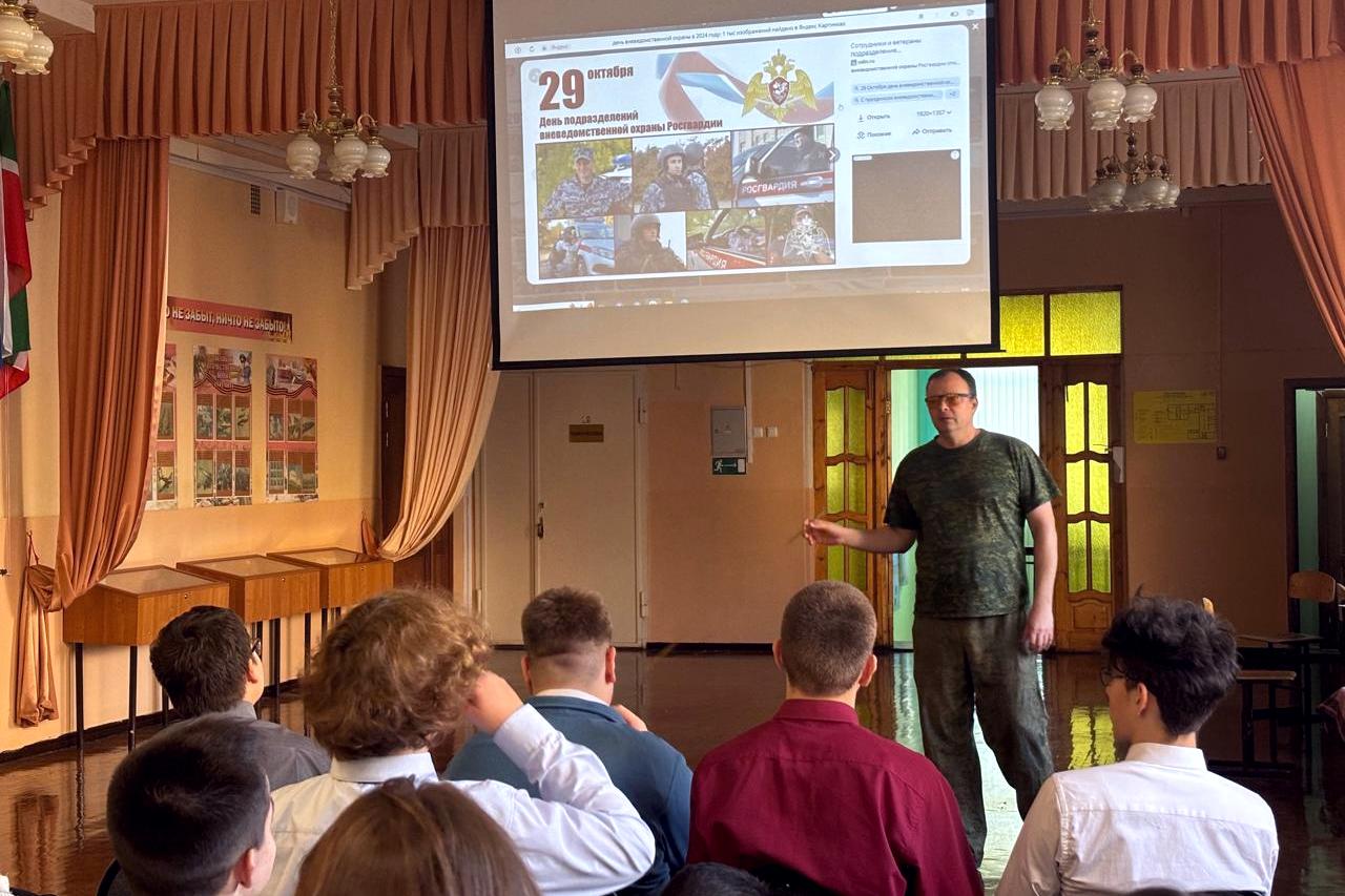 Ветеран казанского УВО Росгвардии майор полиции в отставке Сергей Курылев провёл открытый урок для старшеклассников средней общеобразовательной школы №120, посвящённый Дню образования подразделений вневедомственной охраны.