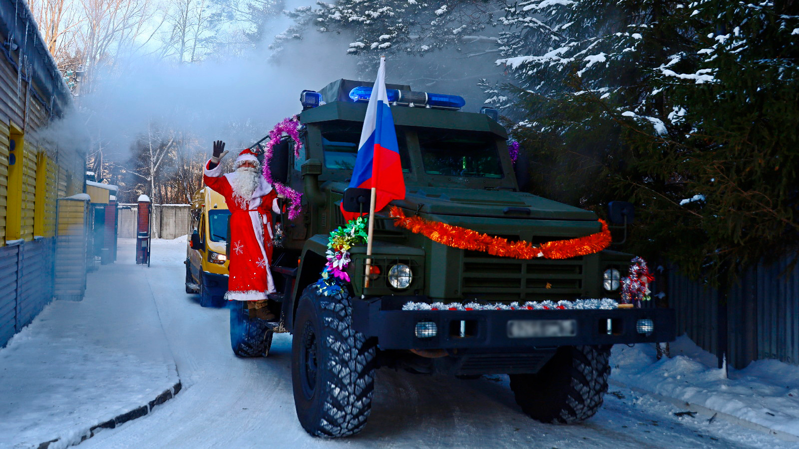Воспитанники социального учреждения радостно приветствовали росгвардейского Деда Мороза, который прибыл к ним на по-новогоднему украшенном броневике. Сказочный чародей поздравил детей с наступающим праздником, пожелал крепкого здоровья, счастья, успехов и мирного неба.